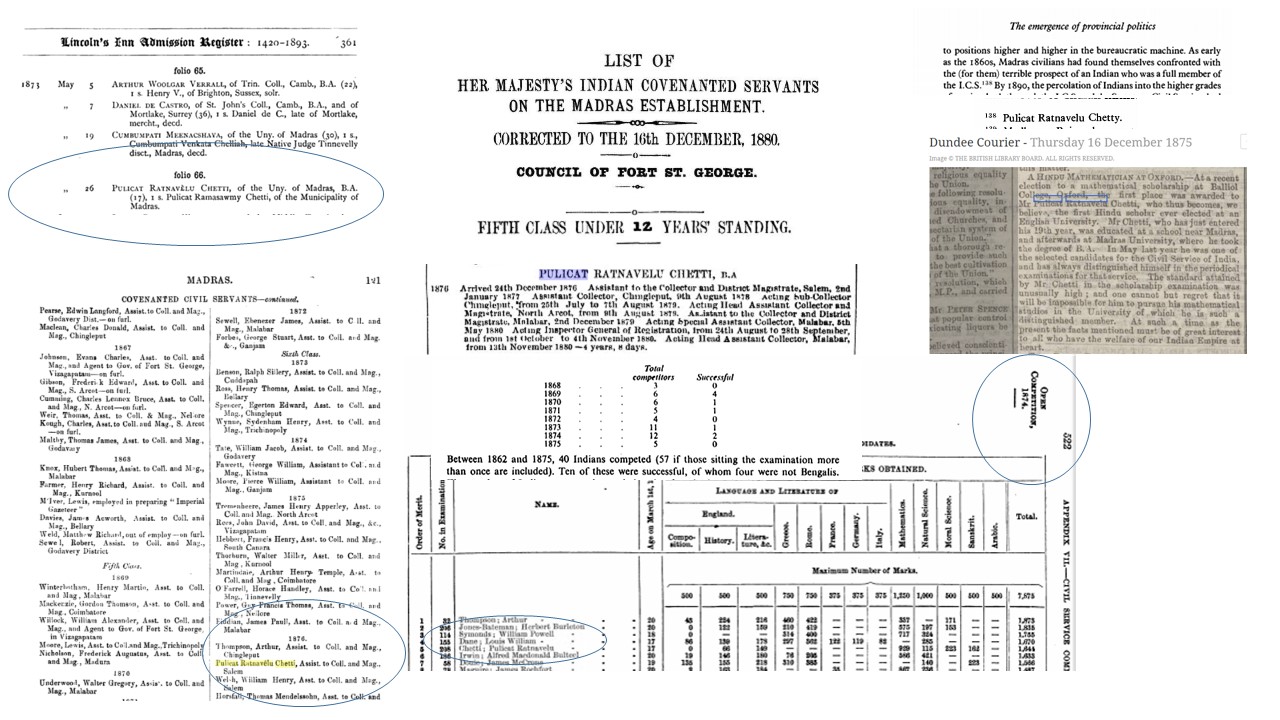 PULICAT RATNAVELU CHETTI, B.A – Arrived 24th December 1876. Assistant to the Collector and District Magistrate, Salem. 2nd January 1877. Assistant Collector, Chingleput, 9th August 1878. Acting Head Assistant Collector and Magistrate, North Arcot. from 9th August 1879. Assistant to the Collector and District Magistrate, Malabar, 2nd December 1879. Assistant special assistant Collector and District Magistrate, Malabar, 5th May 1880, Assistant inspector general of registration from 24th Aug to 28th Sept and from 1st Oct to 4th Nov 1880. Acting Head assistant Collector Malabar from 13th Nov 1880 – 4 years, 8 days (Note that Chetti never moved from an assistant to the collector’s position because the Madras presidency would not seemingly appoint a native in that post).